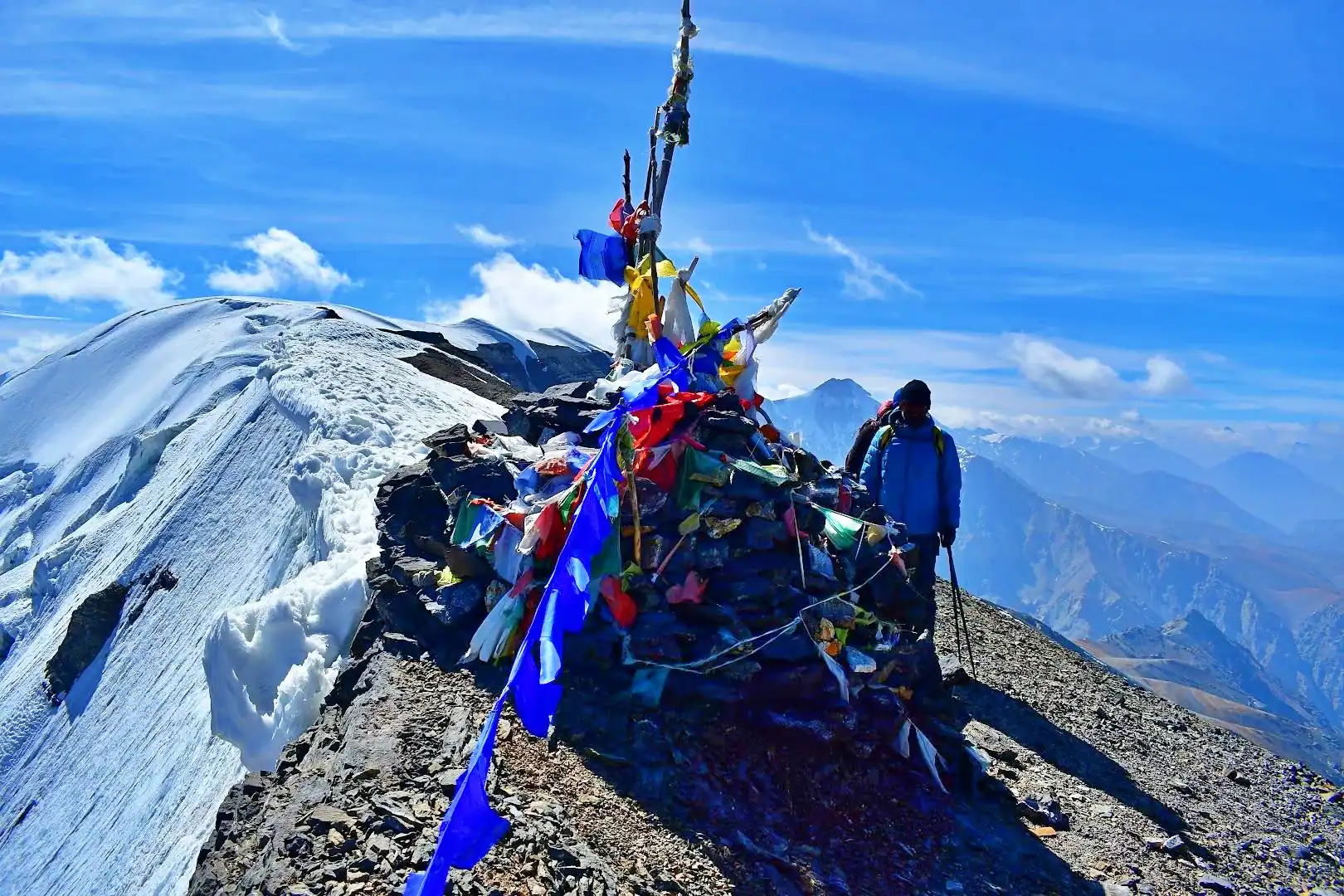 The terrain finally is flattened into a peak ridge , and in just a few seconds you are on top of Kanamo Peak – 5,975 meters or 19,600 feet. The reward is amazing and breathtaking – the 360-degree panorama that spans the Himalayas that spans: